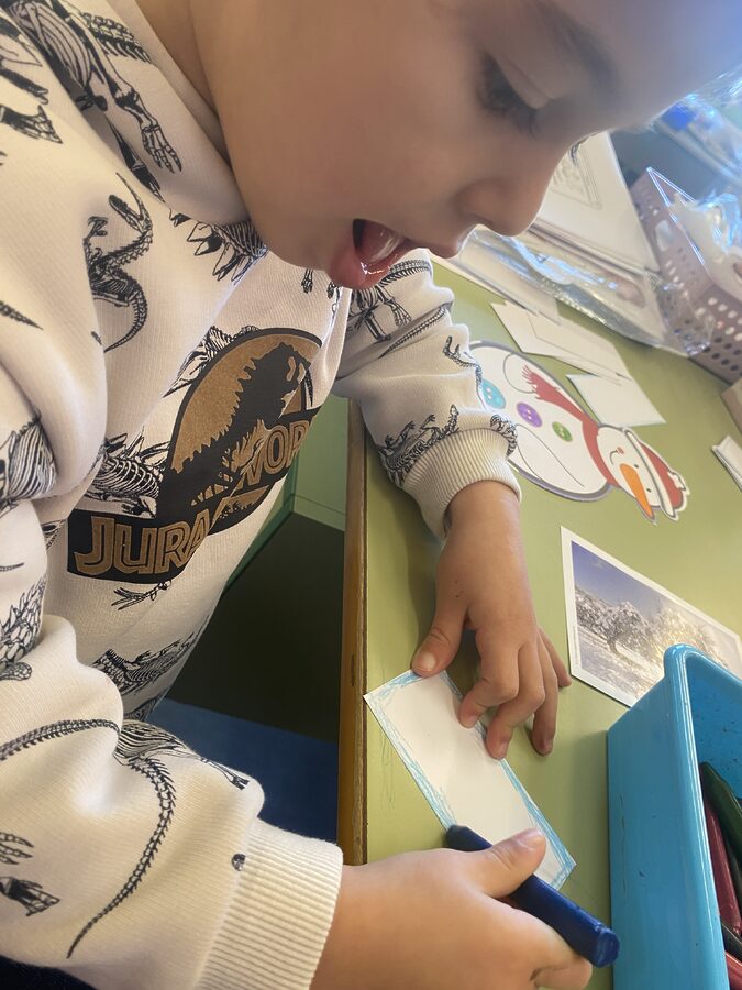 - Con la técnica plástica de poner acuarela sobre cera blanda de color blanco elaboramos copos de nieve.