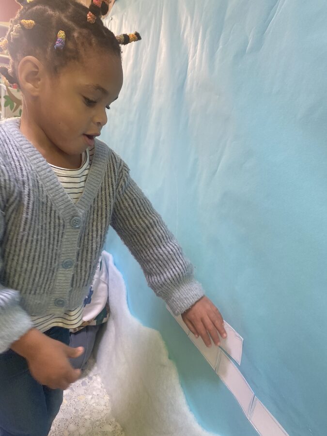 Cogemos trozos de cartulina de desecho con forma rectangular y los decoramos para simular bloques de hielo. También los aprovechamos para nuestro mural final.